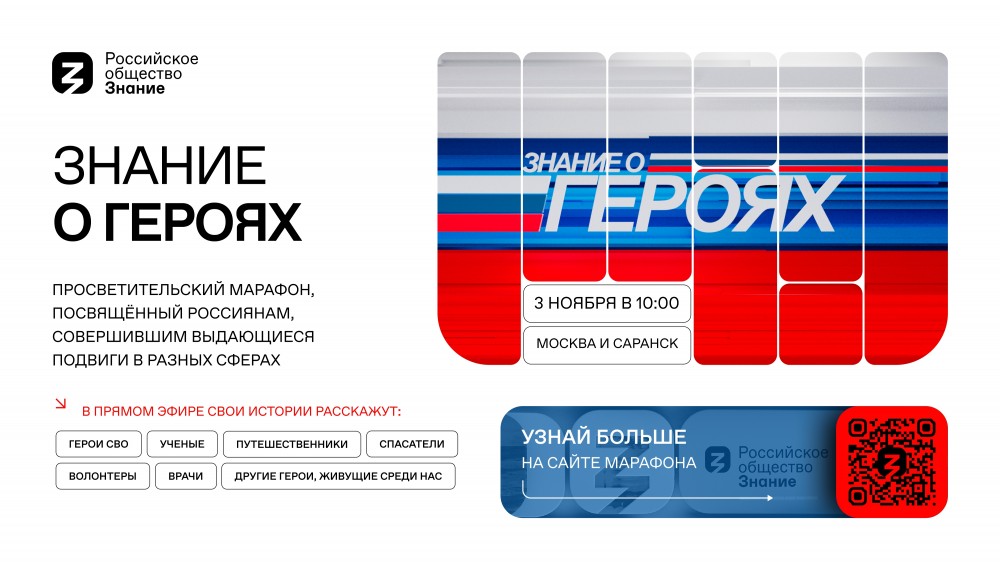 3 ноября стартует просветительский марафон «Знание о героях», приуроченный ко Дню народного единства! Приглашаем вас присоединиться к прямому эфиру и познакомиться с героями современности. Марафон пройдёт на двух площадках: в Москве — в арт-центре «Ветошный» и в Саранске — в новой студии Российского общества «Знание».